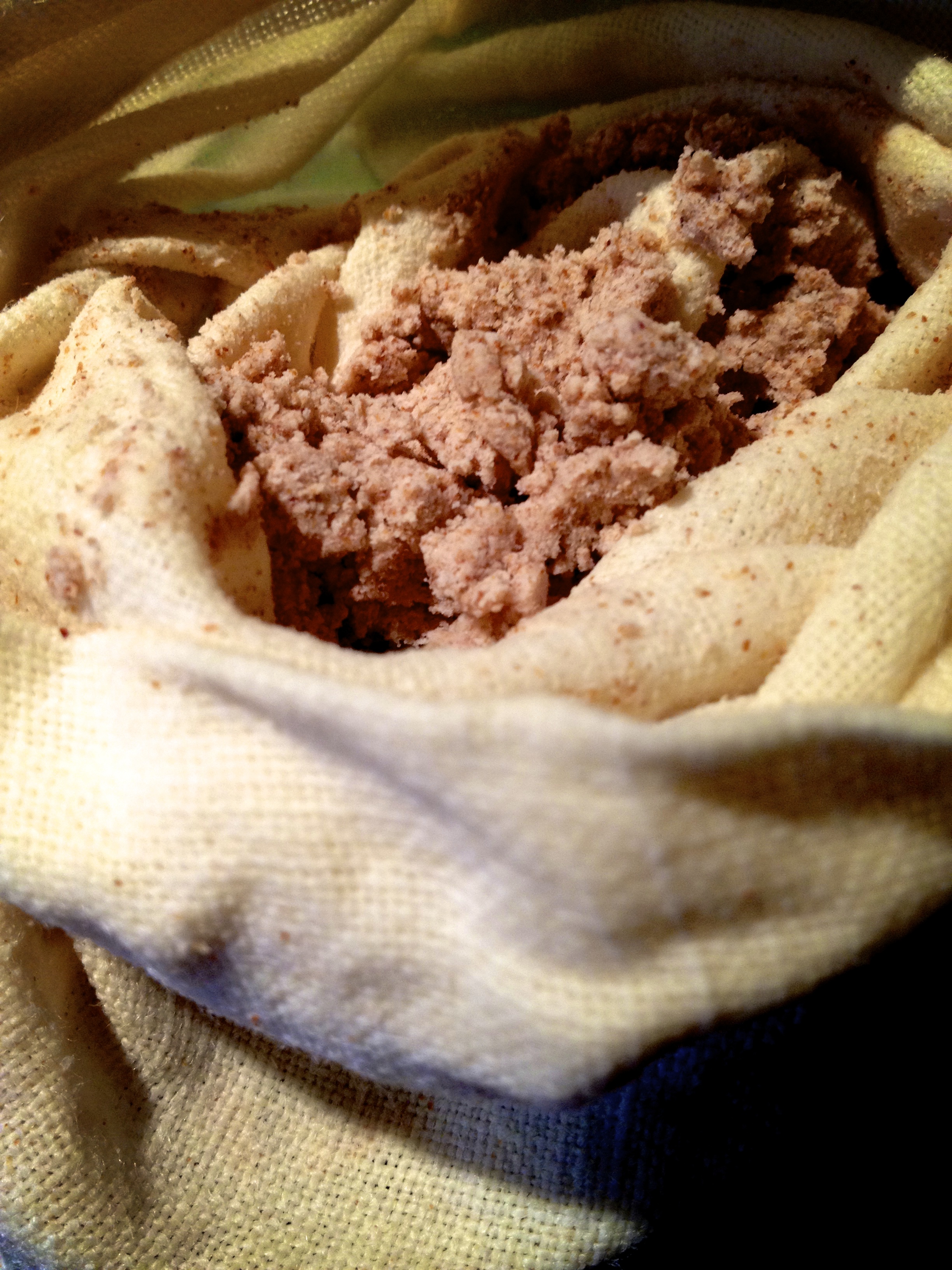 5) Using a cheesecloth or Nut-Milk Bag (you can also try using a fine mesh sieve) strain the contents of the blender. Below is an image showing what was left in the nut-milk bag, the almond pulp. The pulp can be used in baking or dried then blended into almond meal.